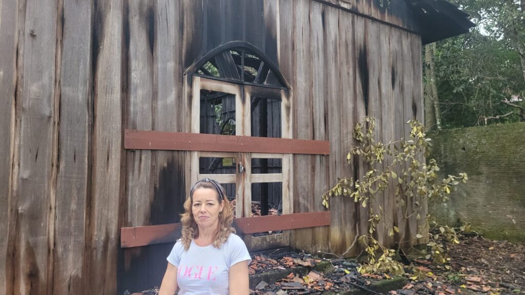 Moradora conta que acionou os bombeiros sobre o incêndio na réplica da primeira igreja católica, no bairro Mina Brasil em Criciúma