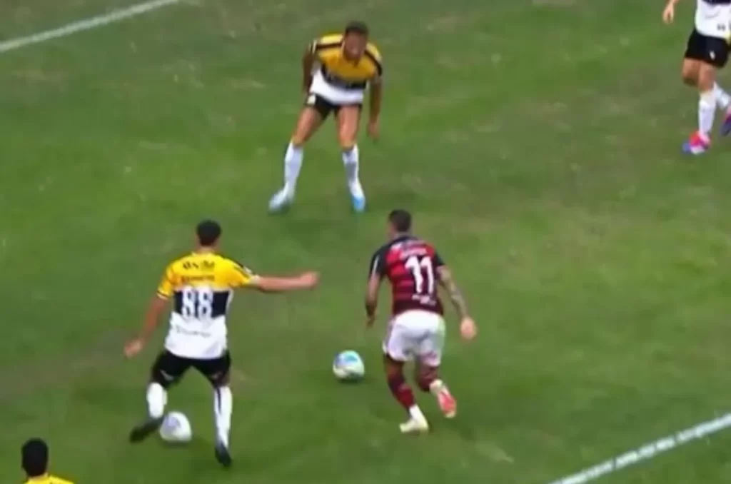 Aos 15 minutos do segundo tempo, o árbitro Maguielson Barbosa marcou a primeira penalidade em um lance em que o jogador Rodrigo, do Criciúma, teria cometido falta dentro da área contra De Arrascaeta, do Flamengo.