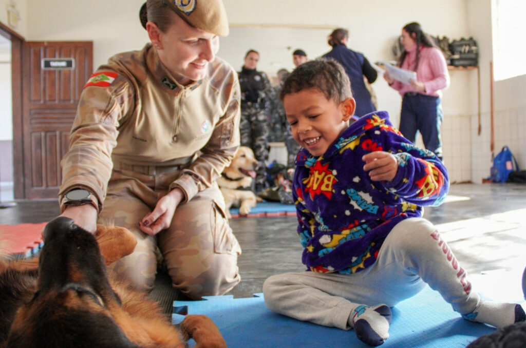 Durante encontros realizados na segunda (23) e terça-feira (24), a equipe catarinense detalhou a metodologia e os resultados do projeto aos agentes da Companhia Independente de Operações com Cães (CIOC) e do Canil K-9 da PM paranaense. No segundo dia, policiais acompanharam na prática a interação entre os cães e as crianças dos CEI Afasc Carlos Piazza e Mãe Nina.