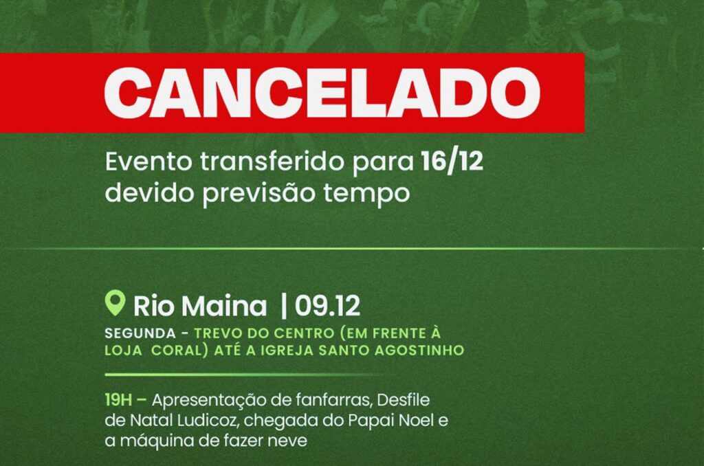 “Infelizmente, o mau tempo nos levou a adiar o desfile, mas estamos preparando tudo com o mesmo carinho e magia para a próxima segunda-feira. Esperamos todos no Rio Maina para vivermos juntos essa noite especial e celebrarmos o Natal com muita alegria!”, destacou André Luiz Santiago de Castro, presidente da CDL.