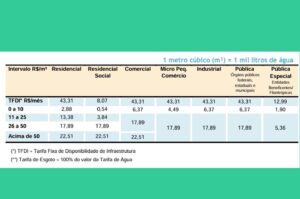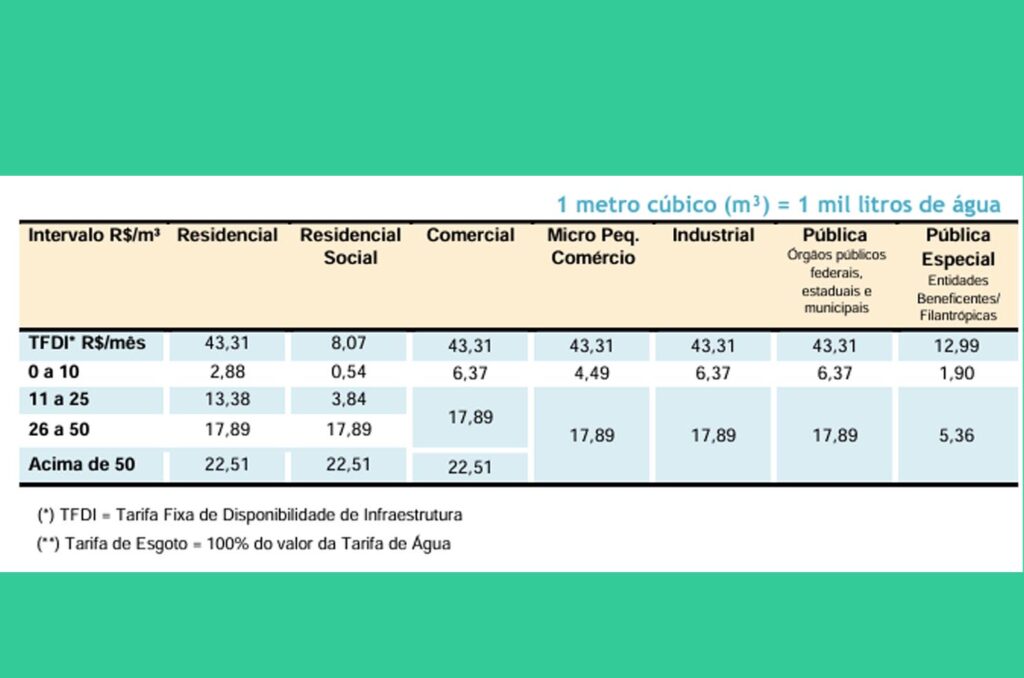 Além desses ajustes, houve também modificações nos valores de consumo de água. A tabela abaixo mostra os novos valores praticados em cada faixa de consumo: