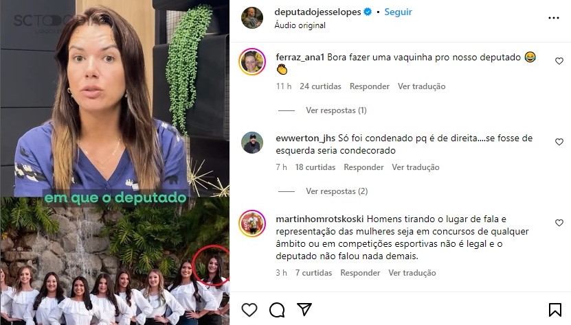 Entre os comentários, houve até sugestões de organizar uma vaquinha para ajudá-lo a pagar a indenização, com a promessa de doar qualquer valor excedente a um orfanato. Outros destacaram que o deputado estaria apenas defendendo as mulheres e a família tradicional, reforçando que concursos femininos deveriam ser destinados exclusivamente a mulheres cisgênero.