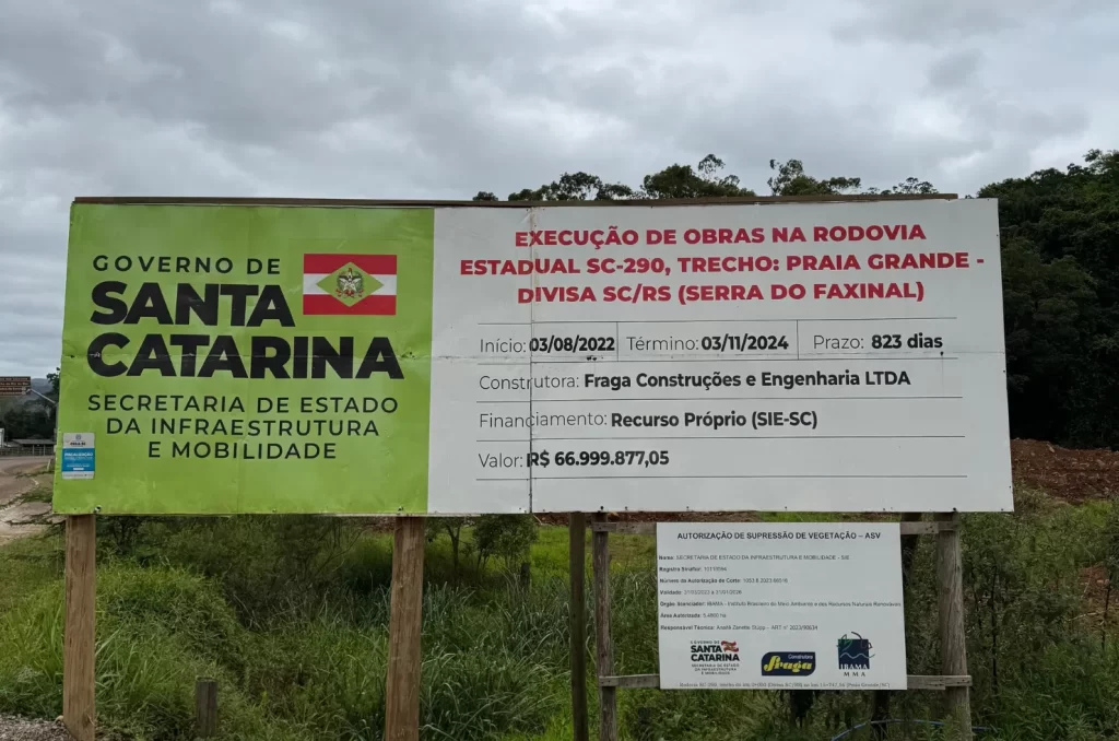 As obras de pavimentação da Serra do Faxinal, na Rodovia SC-290, que conecta Praia Grande, em Santa Catarina, a Cambará do Sul, no Rio Grande do Sul, estão atrasadas e superam o prazo estipulado pelo governo catarinense. Segundo a placa instalada no local, os trabalhos deveriam ter sido concluídos em novembro de 2024.