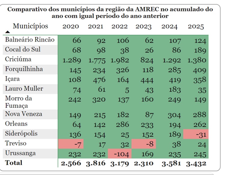 O bom desempenho em 2025 contou com a contribuição dos municípios que compõem a Região Carbonífera. Considerando os 12 municípios, foram acrescentados 3.432 empregos formais no primeiro trimestre.
