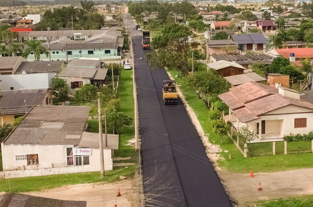 A camada de asfalto já começou a ser colocada na obra de pavimentação da estrada de chão da Tapera, em Passo de Torres – antiga Interpraias. O projeto levará asfalto desde a Rosa do Mar até a divisa com Balneário Gaivota, abrangendo quase 3 km.