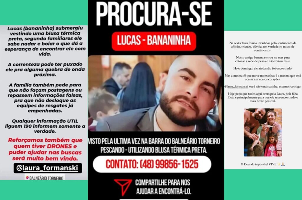 Milhares de pessoas estão mobilizadas nas redes sociais em busca de informações da localização de Lucas (Bananinha), pescador que entrou na água na sexta-feira, dia 10, e segue desaparecido até esta segunda-feira, dia 13. Centenas de pessoas estão envolvidas nas buscas na praia do Torneiro, em Jaguaruna.