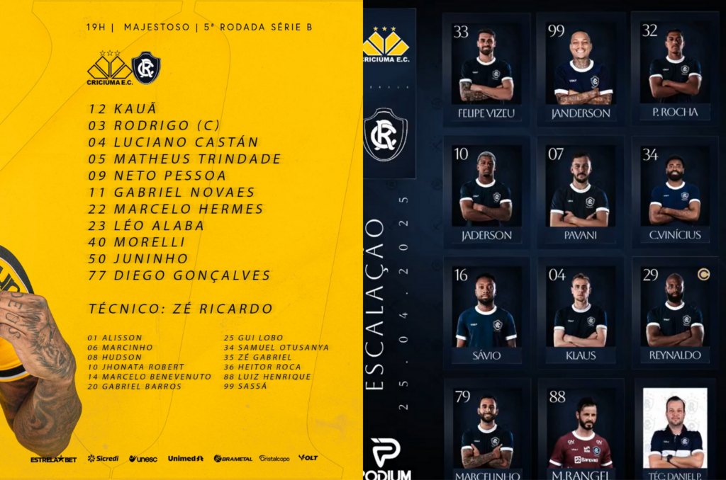 O Criciúma recebe o Remo no Heriberto Hülse pela 5ª rodada do Campeonato Brasileiro da Série B a partir das 19 horas desta sexta-feira (25). As equipes para o confronto de daqui a pouco já estão definidas. Confira as escalações:
