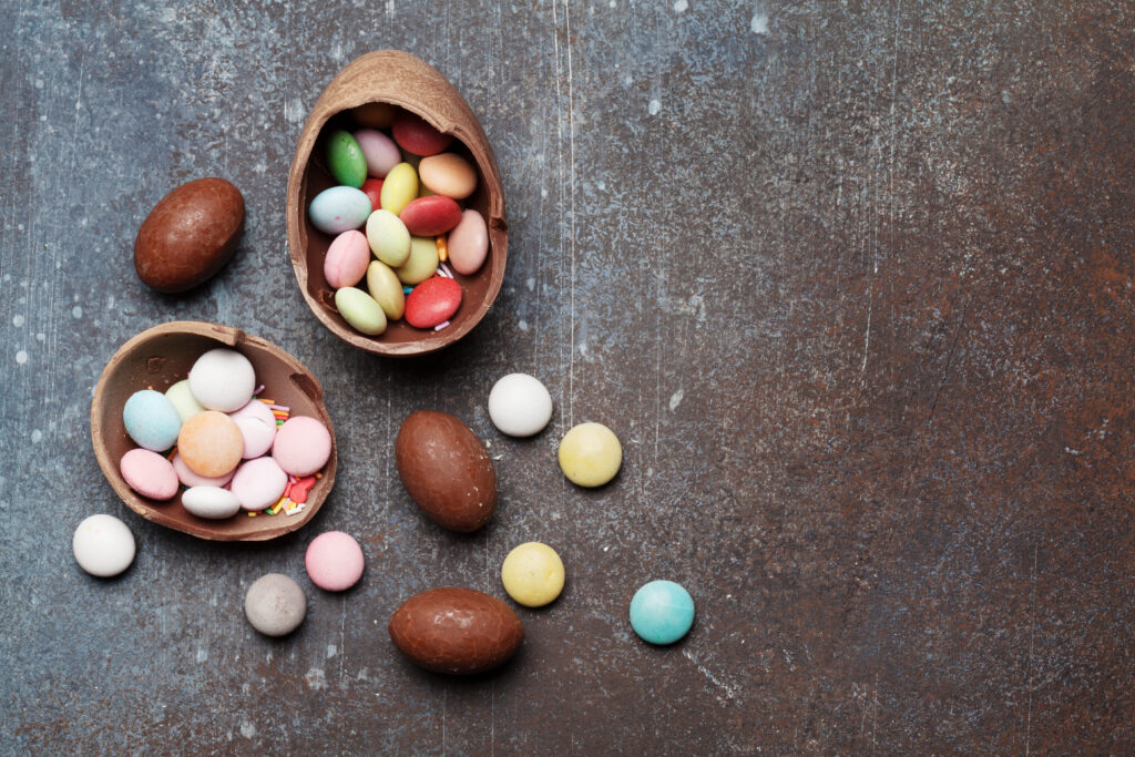 Easter greeting card backdrop with chocolate eggs and colorful candies. Top view on stone table with space for your greetings