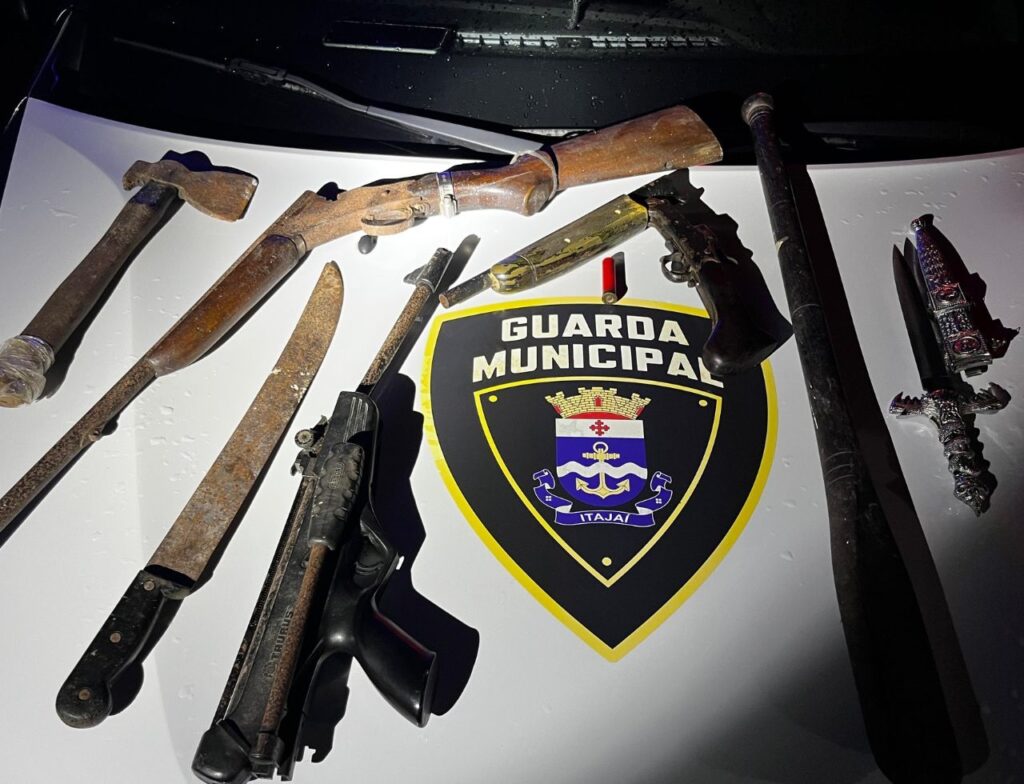 Durante o atendimento, o suspeito confirmou a existência de armas na residência. Com a devida autorização, os agentes realizaram uma busca no imóvel e localizaram duas garruchas calibre 32, sendo uma municiada; uma espingarda de pressão, uma adaga, uma machadinha, um bastão e um facão.