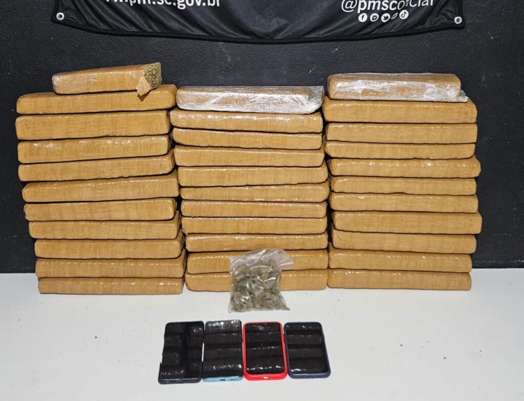 Após ser contido pela guarnição, foi localizado com o homem um pacote com 50 gramas de skunk. Próximo ao ponto de fuga, um veículo Fiat Fiorino foi identificado como pertencente a outro suspeito, de 32 anos, que também foi abordado. Na busca veicular, foram encontrados dois tabletes de maconha no assoalho e outros 30 tabletes na carroceria, totalizando 19,4 quilos da droga. Ambos os envolvidos foram detidos.