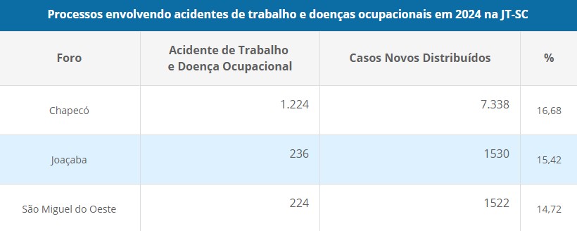 Conforme o TRT/SC, as jurisdições com as maiores proporções de ações sobre acidentes de trabalho em relação ao total de casos foram Chapecó (16,68%), Joaçaba (15,42%) e São Miguel do Oeste (14,72%).