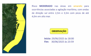 Na orla catarinense, o avanço de um ciclone extratropical provoca ventos de 30 a 40 km/h, com rajadas entre 70 e 80 km/h, elevando as ondas a 2,5–3,5 m no litoral Sul e Florianópolis e até 4 m em alto mar. No Litoral Norte, as ondas variam entre 2 m e 3 m. Há risco moderado a alto para pesca, navegação e esportes náuticos — além de alerta para quem estiver na orla.