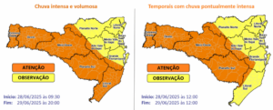 Desde a madrugada de sábado (28), a formação de uma frente quente na divisa com o RS traz risco moderado a alto de temporais, chuva intensa e volumosa, com incidência maior nas regiões do Oeste, Planalto Sul e Litoral Sul — com potencial para alagamentos, enxurradas, destelhamentos, quedas de galhos e danos na rede elétrica. No domingo (29), essa frente se transforma em frente fria, mantendo o risco elevado também no Grande Oeste, Planaltos, Alto Vale do Itajaí e Grande Florianópolis.