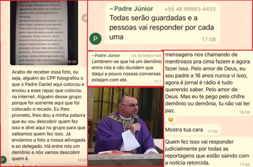 Mas, ao que tudo indica, vazou. E ao ver que veículos de comunicação divulgaram a nota do padre, o vigário-geral da Diocese de Criciúma ficou indignado. “Lembrem-se que há um demônio entre nós e não duvidem que daqui a pouco nossas conversas estejam com ele”, diz o vigário Antônio Júnior, se referindo a um locutor de um veículo de comunicação da região. O padre Antônio Júnior ainda ameaça: “Quem fez isso vai responder judicialmente por todas as reportagens que estão saindo com a notícia retorcida”, acrescenta.