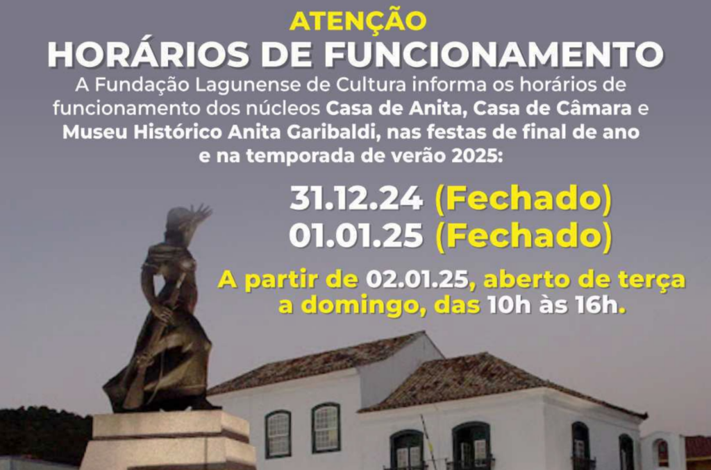 A Fundação Lagunense de Cultura (FLC) informou que nesta terça (31/12) e quarta-feira (01/01), os museus Casa de Anita, Casa de Câmara e Museu Histórico Anita Garibaldi estarão fechados.