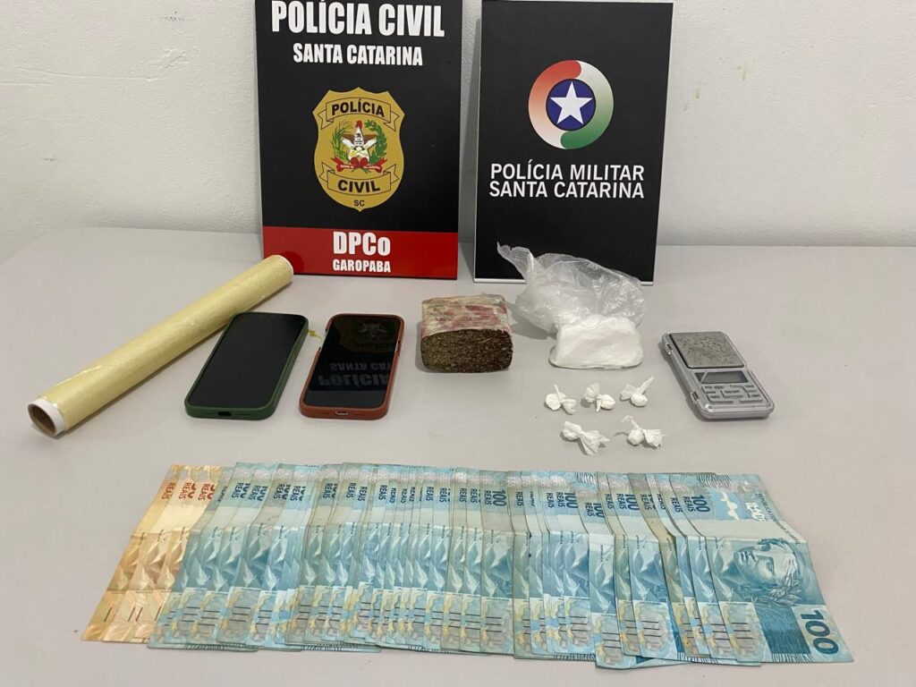 Após buscas na residência, foram apreendidos 76 gramas de cocaína, 150 gramas de maconha, R$ 5.150,00 em dinheiro e um aparelho celular.