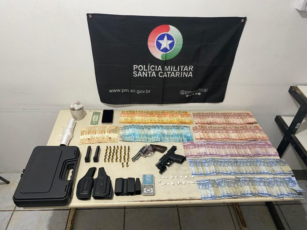 Jovem é preso e duas armas de fogo, munições, drogas e dinheiro são apreendidos em Araranguá, na noite dessa quinta-feira, 23, em ação da Polícia Militar de Santa Catarina (PMSC), através do 19º Batalhão de Polícia Militar (BPM). A abordagem do suspeito ocorreu no bairro Cidade Alta e a prisão foi pelos crimes de posse irregular de arma de fogo e tráfico de drogas.