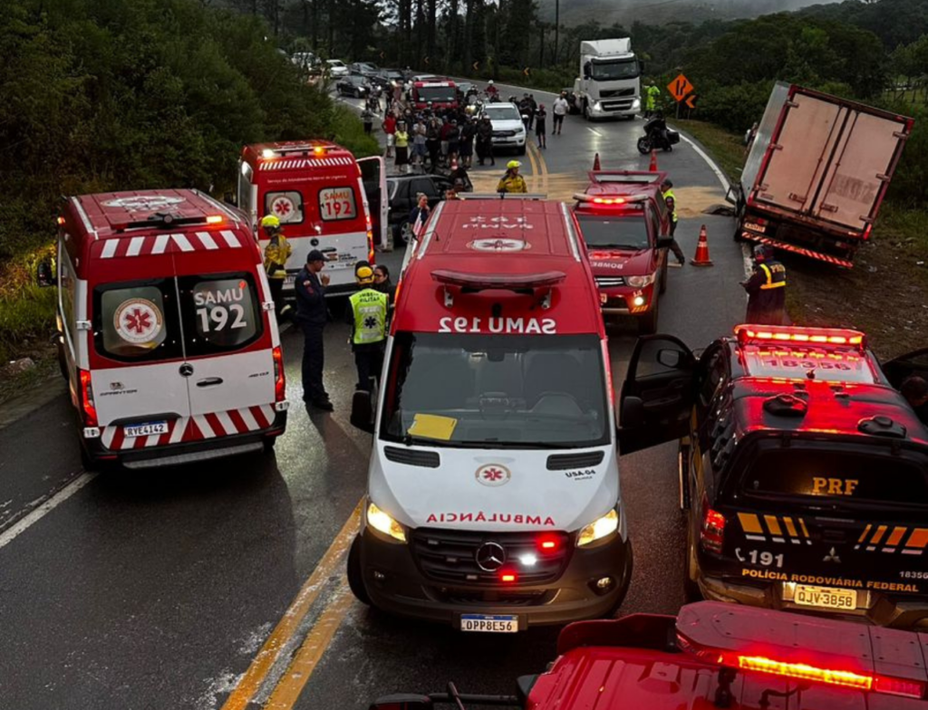 Na tarde deste domingo (29), o Corpo de Bombeiros Militar de Santa Catarina (CBMSC) foi chamado para atender um grave acidente na BR-282, km 54, em Águas Mornas. A colisão frontal entre um caminhão e um automóvel resultou em quatro vítimas no carro, enquanto os dois ocupantes do caminhão saíram ilesos e não precisaram de atendimento médico. O resgate foi complexo e envolveu técnicas especializadas para o desencarceramento das vítimas.