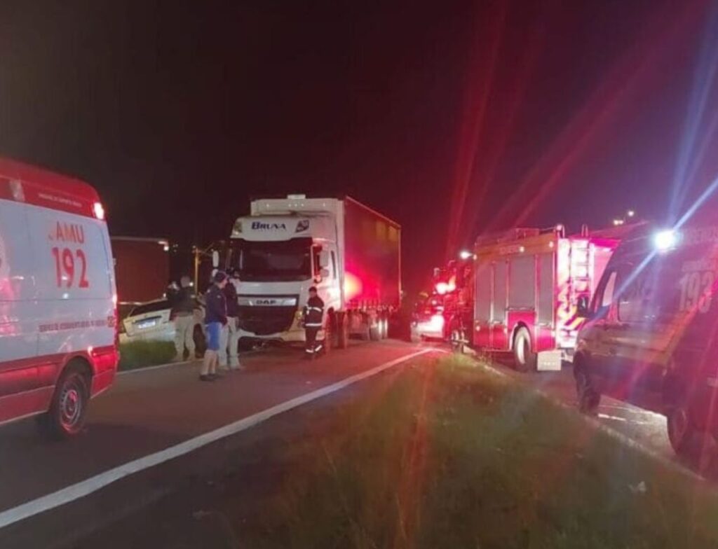 Segundo os bombeiros que atenderam a ocorrência, por pouco a colisão envolvendo o automóvel com excesso de ocupantes não terminou em tragédia. Os veículos percorriam a rodovia na altura do bairro Salto do Norte quando a colisão frontal ocorreu. A Polícia Rodoviária Federal não detalhou a dinâmica, mas o caminhoneiro não se feriu.