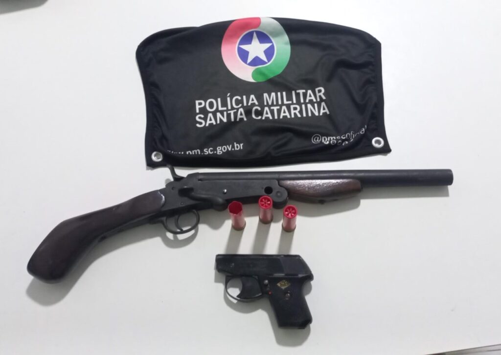 No local, os policiais militares abordaram e prenderam em flagrante o autor das agressões, um homem, de 51 anos. No decorrer da ocorrência, na residência do autor, foram localizadas e apreendidas uma pistola de origem alemã e uma espingarda artesanal de calibre 28, com três munições, sendo uma deflagrada e 2 munições intactas. As armas de fogo estavam irregulares, não possuindo documentação de registro.