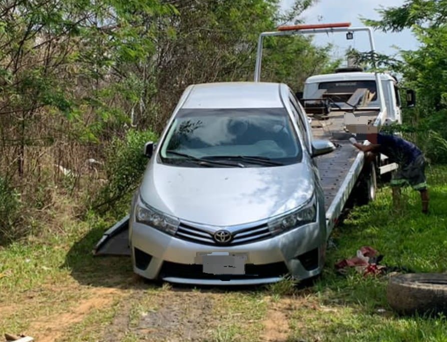 A guarnição policial localizou o veículo Toyota/Corolla , roubado algumas horas antes, na madrugada, escondido em um matagal,