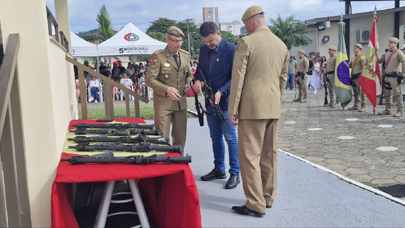 Também na solenidade, ocorreu o ato de entrega de fuzis (calibre 5.56) para serem utilizadas pelo efetivo do 5ºBPM, adquiridos com recursos de convênio firmado entre a PMSC e a Prefeitura Municipal de Tubarão.