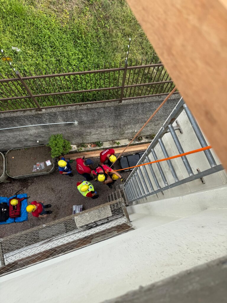 O sistema empregado contou com uma ancoragem humana no cabo principal e um segundo cabo de segurança, com trava-quedas, instalado em outro ponto da estrutura. O conjunto de técnicas garantiu estabilidade e proteção tanto para a vítima quanto para o socorrista envolvido diretamente no resgate.