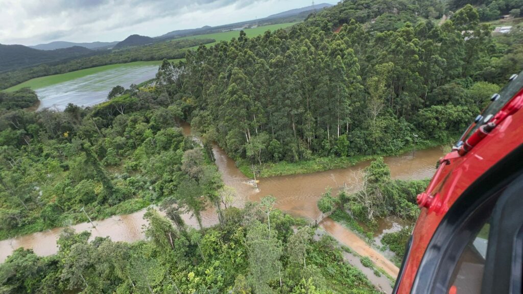 O Corpo de Bombeiros Militar de Santa Catarina foi acionado para resgatar três pessoas ilhadas na passagem do Maciambu, em Palhoça. Os indivíduos estavam sobre o teto de um carro, arrastado pela força das águas. Para o resgate, o helicóptero Arcanjo-01 e uma caminhonete de apoio foram mobilizados. A aeronave constatou que as vítimas estavam em um ponto seguro, mas ainda cercadas pela enchente.