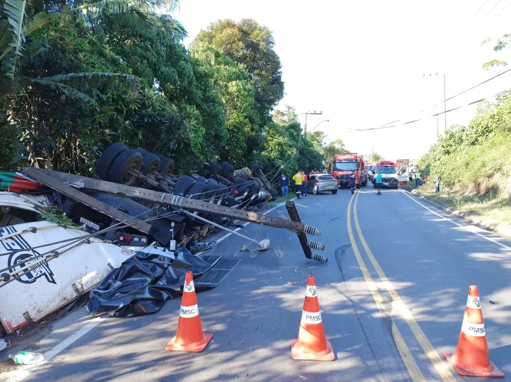 Após o acionamento do Corpo de Bombeiros (CBMSC), as guarnições deslocaram e no local foi constatado que o caminhão cruzou a pista no sentido contrário e tombou ao fazer a curva, vindo a capotar e cair para o lado de fora da rodovia. Além disso, ao tombar a carroceria do caminhão bateu em um poste de transmissão de energia, quebrando-o e na sequência, o automóvel colidiu frontalmente com o caminhão.