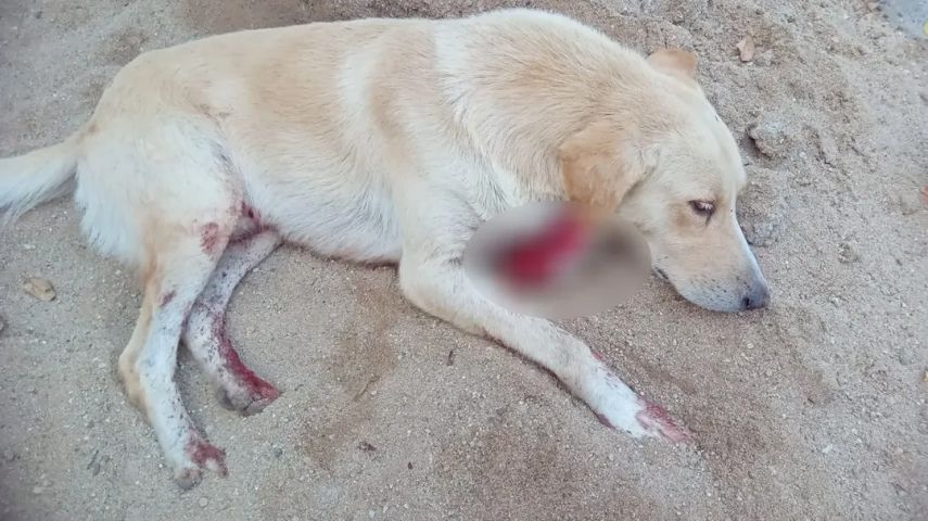 Um cão com ferimentos profundos foi encontrado próximo ao estacionamento do Hospital de Laguna nesta quarta-feira (26).