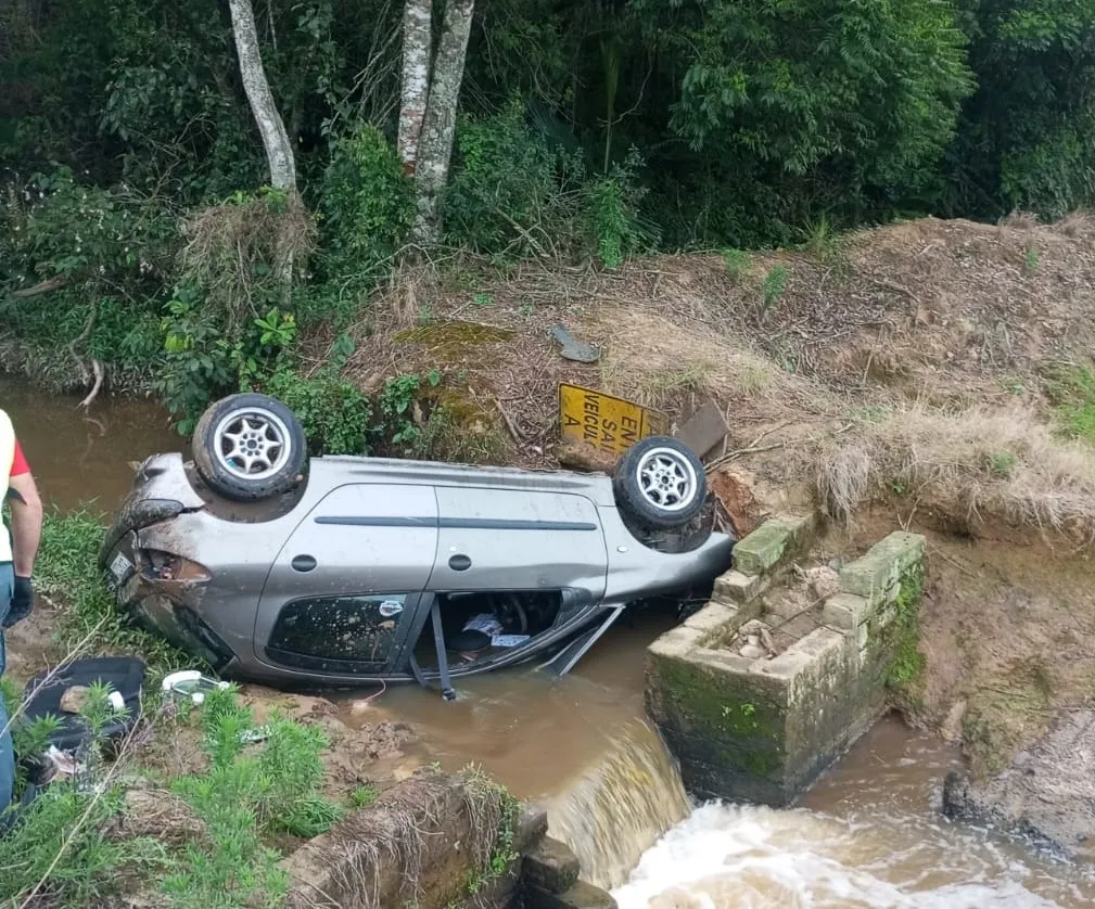 Na tarde desta segunda-feira, 07, por volta das 16h, uma saída de pista seguida de capotamento deixou duas mulheres feridas nas proximidades do Rio Jundiá, na Rodovia SC-108, no bairro Alto Rio Jundiá, em Turvo.