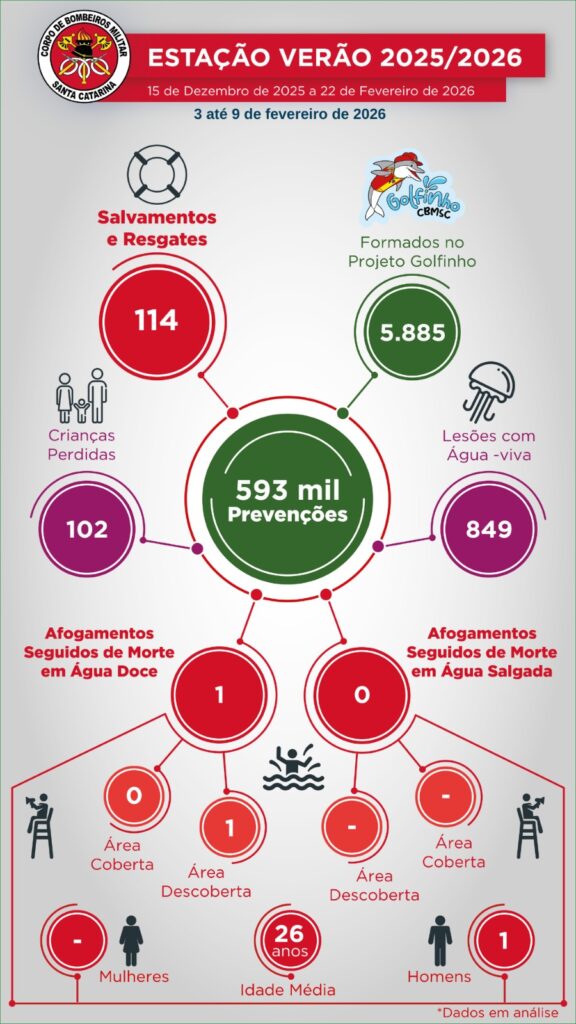 Entre 15 de dezembro de 2025 e 31 de janeiro de 2026, o CBMSC contabilizou cerca de 10 milhões de ações preventivas, como orientações diretas ao público e alertas em áreas de risco. No mesmo período do ano anterior, foram oito milhões de ações.