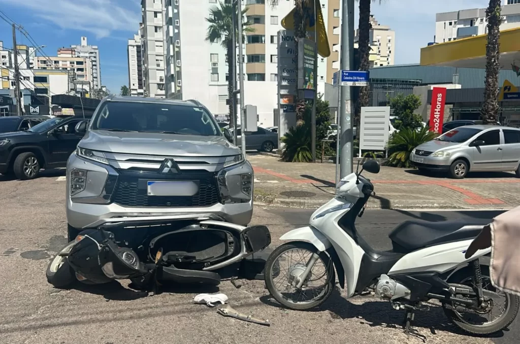 Uma colisão envolvendo um Mitsubishi Pajero e duas motocicletas foi registrada por volta das 12h15 deste sábado (22), no cruzamento das Ruas Joaquim Nabuco e Celestina Zilli Rovaris, no Centro de Criciúma.