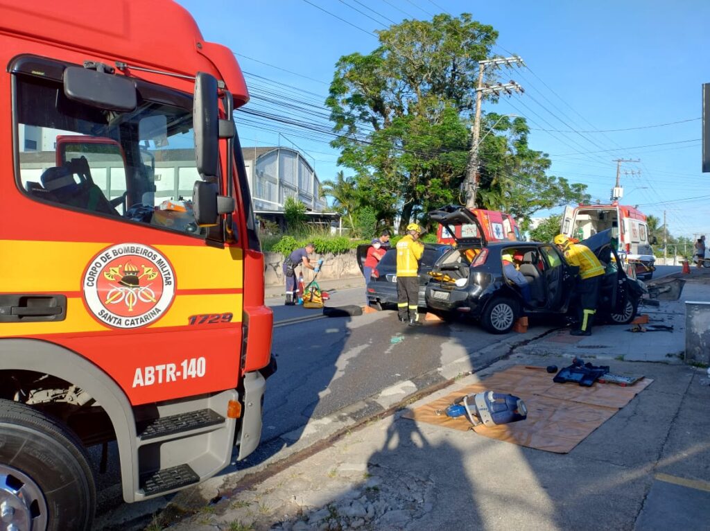 Na manhã deste sábado (29), o Corpo de Bombeiros Militar de Santa Catarina (CBMSC) atendeu a um acidente de trânsito na Rua Santos Saraiva, no bairro Estreito, em Florianópolis. A colisão frontal entre dois veículos deixou quatro vítimas, sendo que duas ficaram presas às ferragens. As equipes realizaram o resgate com segurança e prestaram atendimento pré-hospitalar antes de encaminhá-las para hospitais da região.