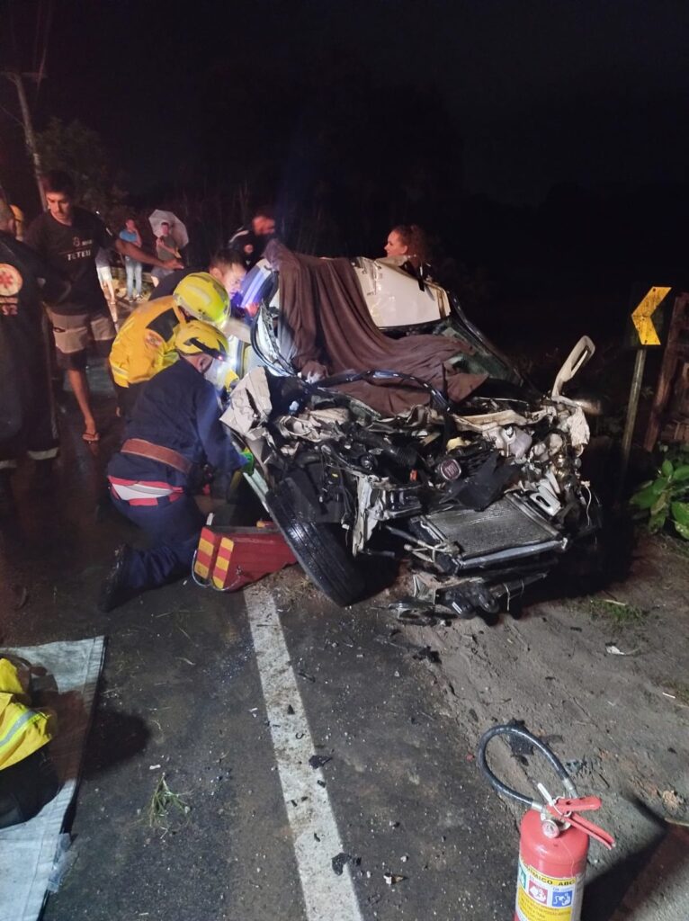 Equipes do CBMSC de Biguaçu deslocaram um caminhão e uma ambulância ao local, com apoio da ambulância Bravo-06 do SAMU. O motorista do caminhão conseguiu sair do veículo sozinho e deixou o local antes da chegada dos socorristas. No Fiat Strada, estavam duas pessoas: um homem com leves escoriações, que já havia saído do veículo, e uma mulher que permanecia presa nas ferragens, apresentando graves fraturas no rosto e nas pernas.