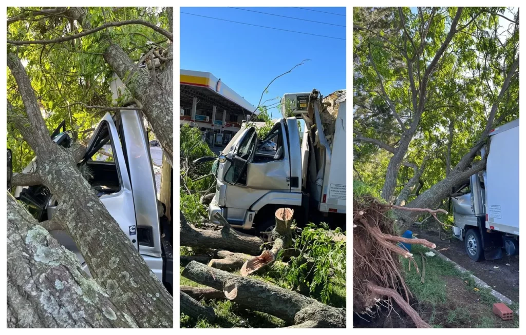 Condutor escapa ileso após árvore esmagar cabine de caminhão em Jaguaruna