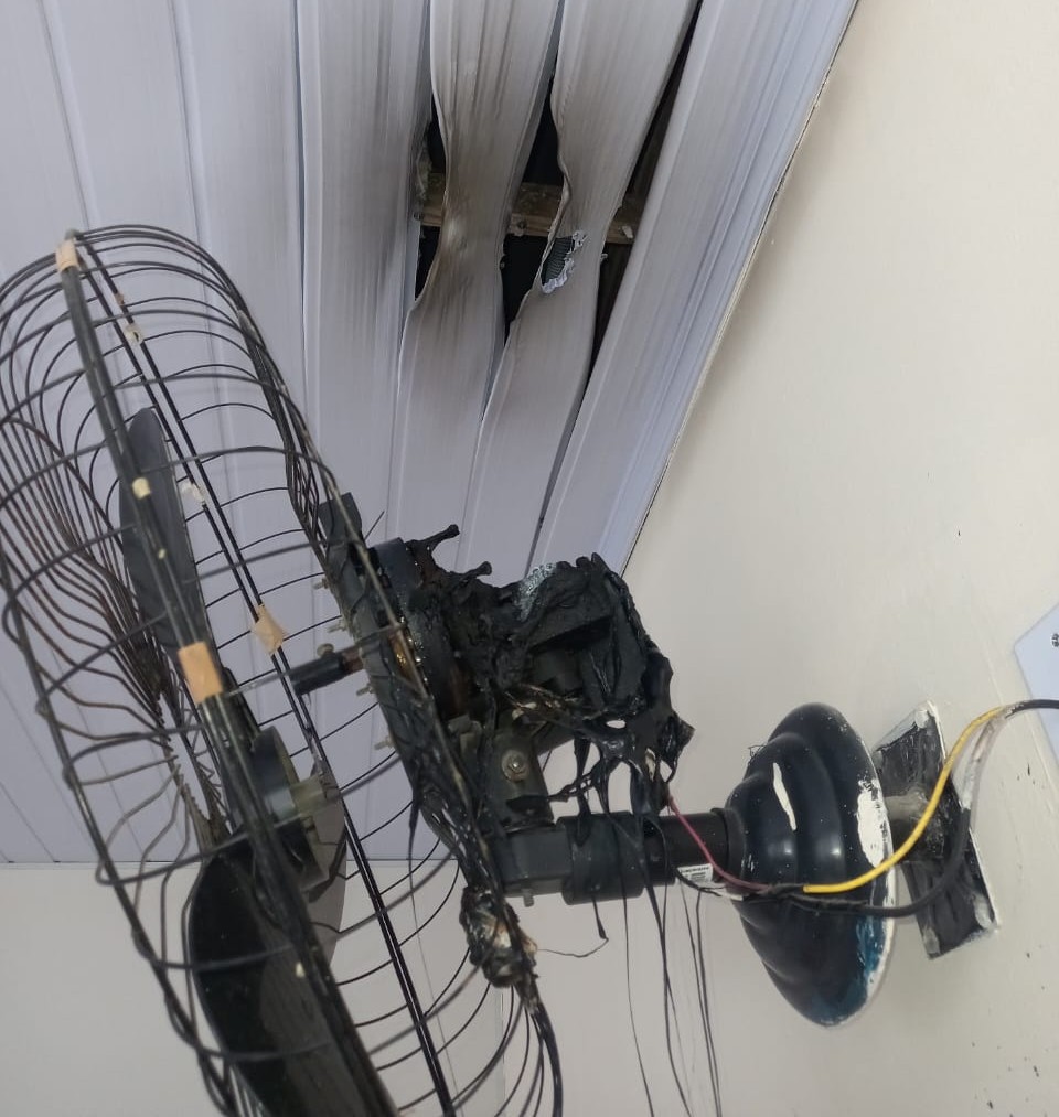 A diretora da unidade de ensino foi até o quartel do Corpo de Bombeiros e informou que um ventilador de parede havia sido danificado pelo fogo.