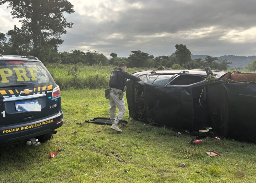Policiais rodoviários federais deram ordem de parada para o condutor do automóvel com placas de Jesuítas/PR que não obedeceu e fugiu em alta velocidade, ultrapassando pelo acostamento e realizando diversas manobras perigosas, até perder o controle da direção e capotar. O homem ainda tentou fugir a pé, mas foi alcançado pela equipe policial e preso.