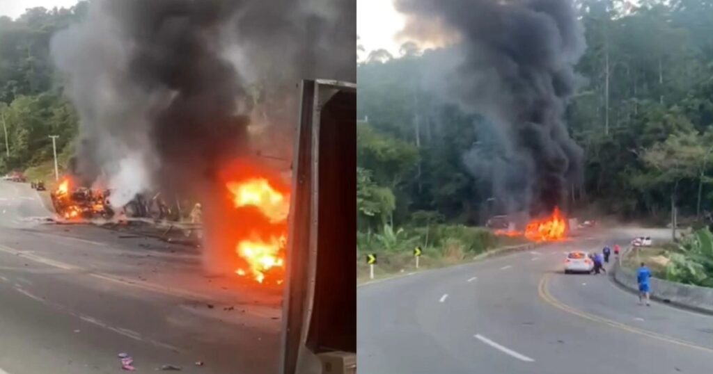 De acordo com a Polícia Rodoviária Federal, a colisão entre veículos foi seguida por incêndio, envolvendo carreta, ônibus de passageiros e Fiat/Fiorino. Bombeiros já contiveram as chamas.