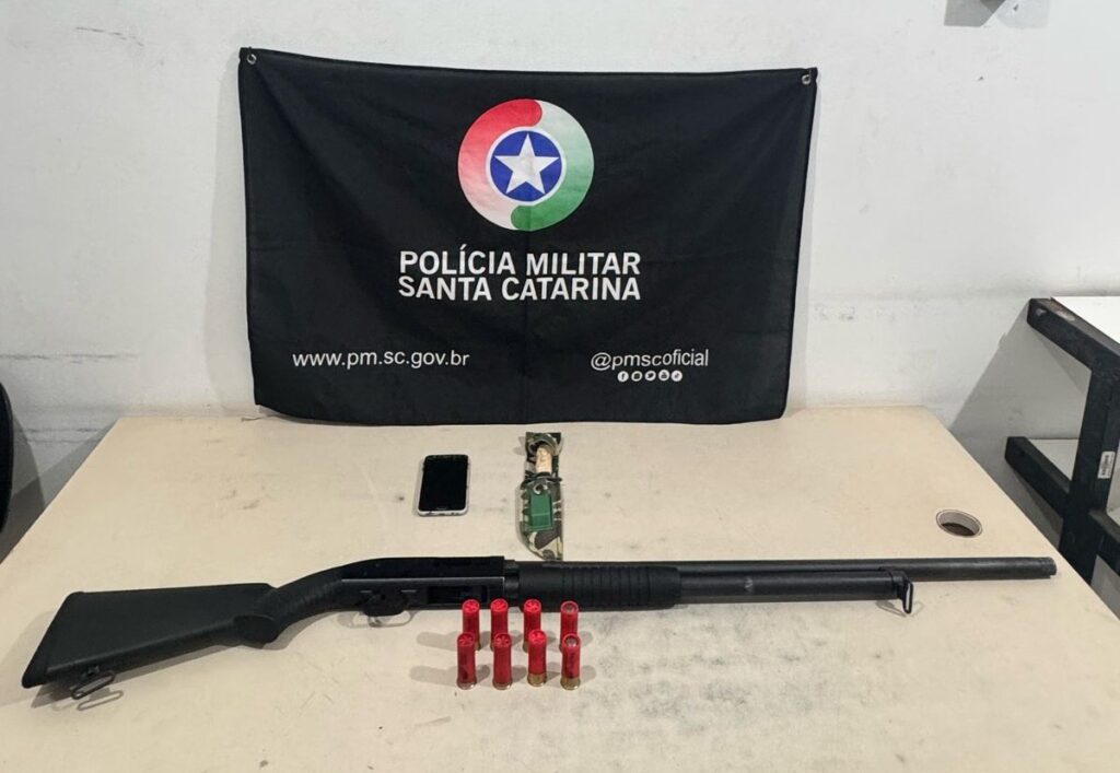 Outras guarnições policiais prestaram apoio e em busca veicular localizaram uma espingarda, calibre 12, municiada e carregada com oito munições e uma faca.