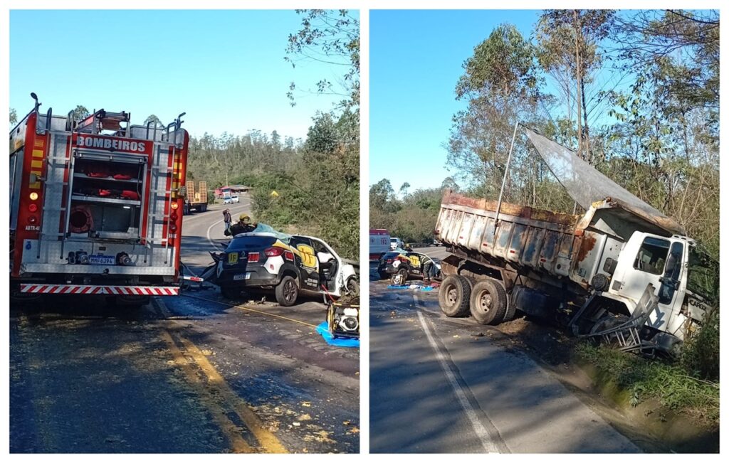 O acidente envolveu um caminhão Ford Cargo, com placas de Criciúma, carregado com bagaço e casca de laranja, que colidiu com um automóvel Renault Kwid com placas de Lages.
