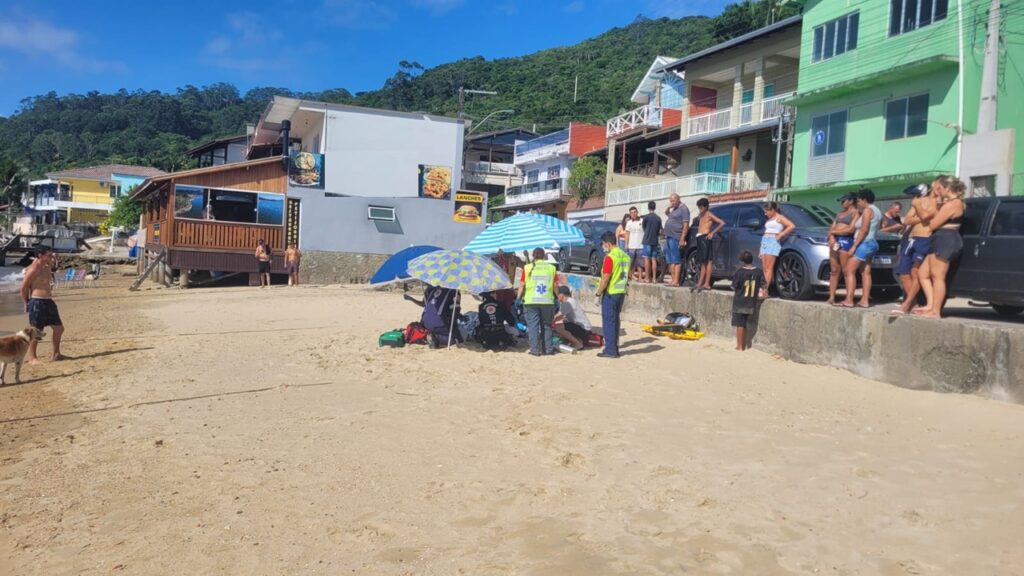 A vítima estava na areia sendo atendida pelo Samu e pelos guarda-vidas. A equipe de suporte médico avançado do Arcanjo-01 prosseguiu com o atendimento.