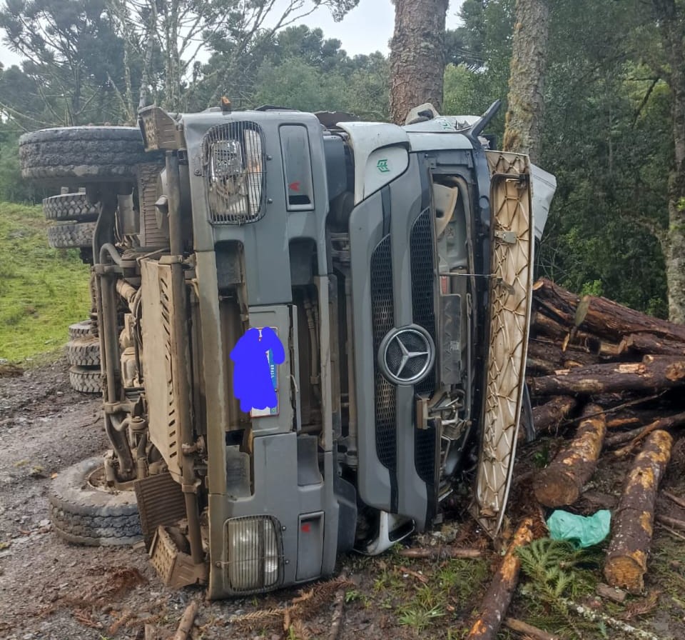 O tombamento de um caminhão carregado com toras de madeira ocorreu em uma descida íngreme, onde o mesmo parou ao se chocar com uma araucária, danificando e arrancando o teto da cabine, em que estava o idoso, de 60 anos.