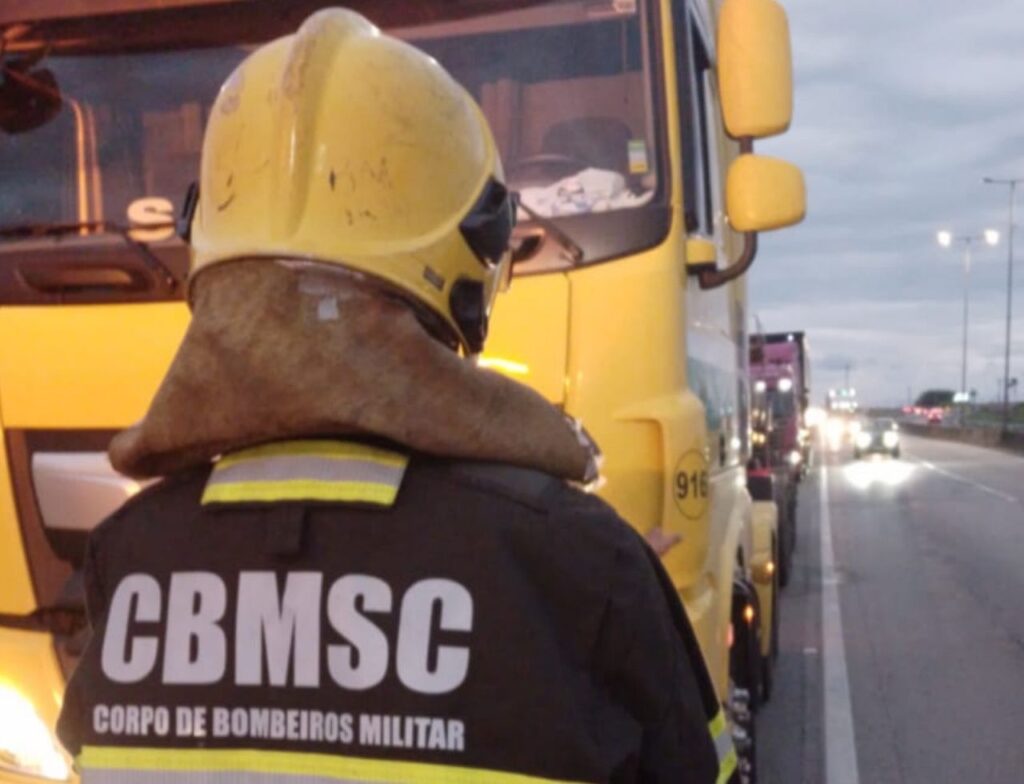 O Corpo de Bombeiros de Araquari atendeu por volta das 18h30 de sábado (21), no acostamento da BR 101, um início de incêndio em carreta que transportava produto químico.