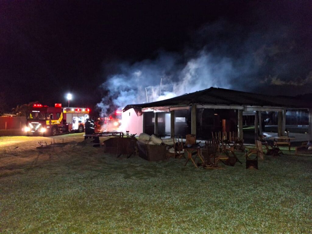 Na madrugada de terça-feira (29), o Corpo de Bombeiros Militar de Santa Catarina foi acionado para conter um incêndio em uma estrutura utilizada como salão de festas, localizada no bairro Ratones, em Florianópolis. A ocorrência foi atendida pelo 1º Batalhão de Bombeiros Militar. A edificação, com cerca de 170 m² e construída em alvenaria e madeira, já apresentava colapso parcial no telhado quando as equipes chegaram, com chamas e fumaça visíveis à distância. Apesar da porta estar aberta, o acesso do caminhão dos bombeiros foi dificultado pela rua estreita e vegetação nas laterais.