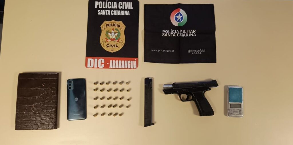 No imóvel em que o rapaz se encontrava em Araranguá, os policiais apreenderam uma pistola, cartuchos/munições