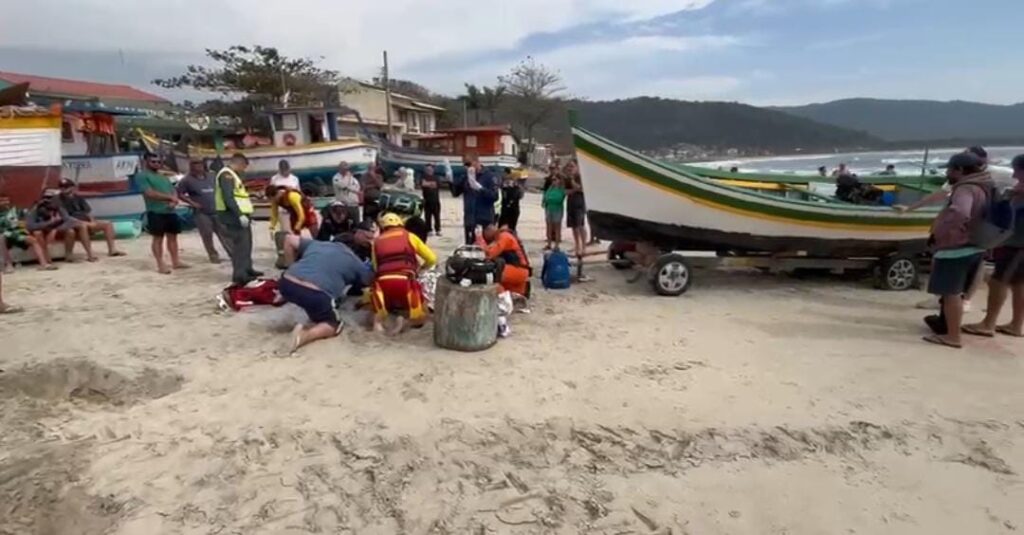 A vítima, um homem de 23 anos, teve o rosto esmagado após ficar preso entre uma embarcação e sua quilha. Quando os socorristas chegaram, ele já recebia os primeiros atendimentos dos guarda-vidas na areia.
