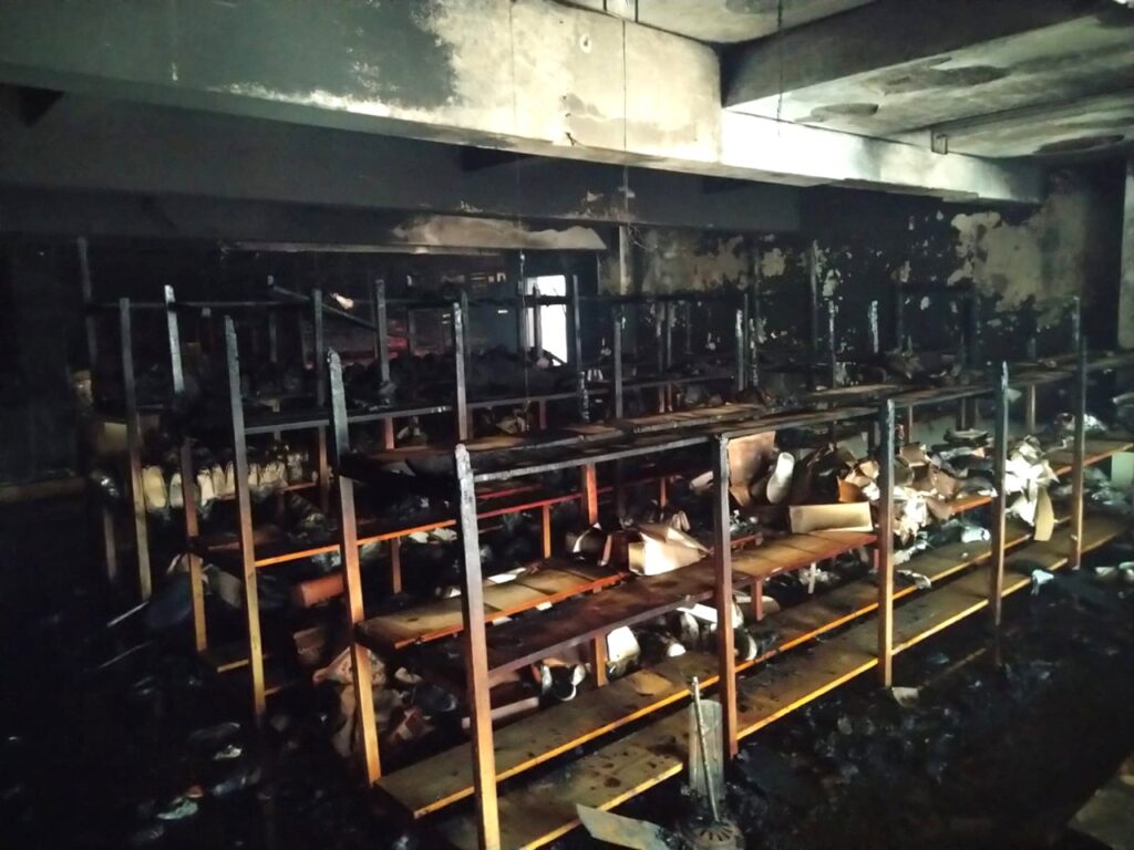 O fogo, que já estava em fase de crescimento quando os bombeiros chegaram, destruiu prateleiras de madeira, caixas de calçados e um mezanino de aproximadamente 9 m², que colapsou durante a propagação das chamas.