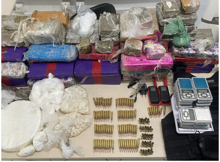 A ação da Polícia Militar resultou na apreensão de 50 quilos de maconha, quatro quilos de cocaína, munições, um colete balístico, rádios comunicadores e algumas balanças de precisão que estavam escondidos no telhado do imóvel.