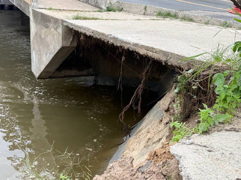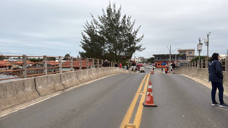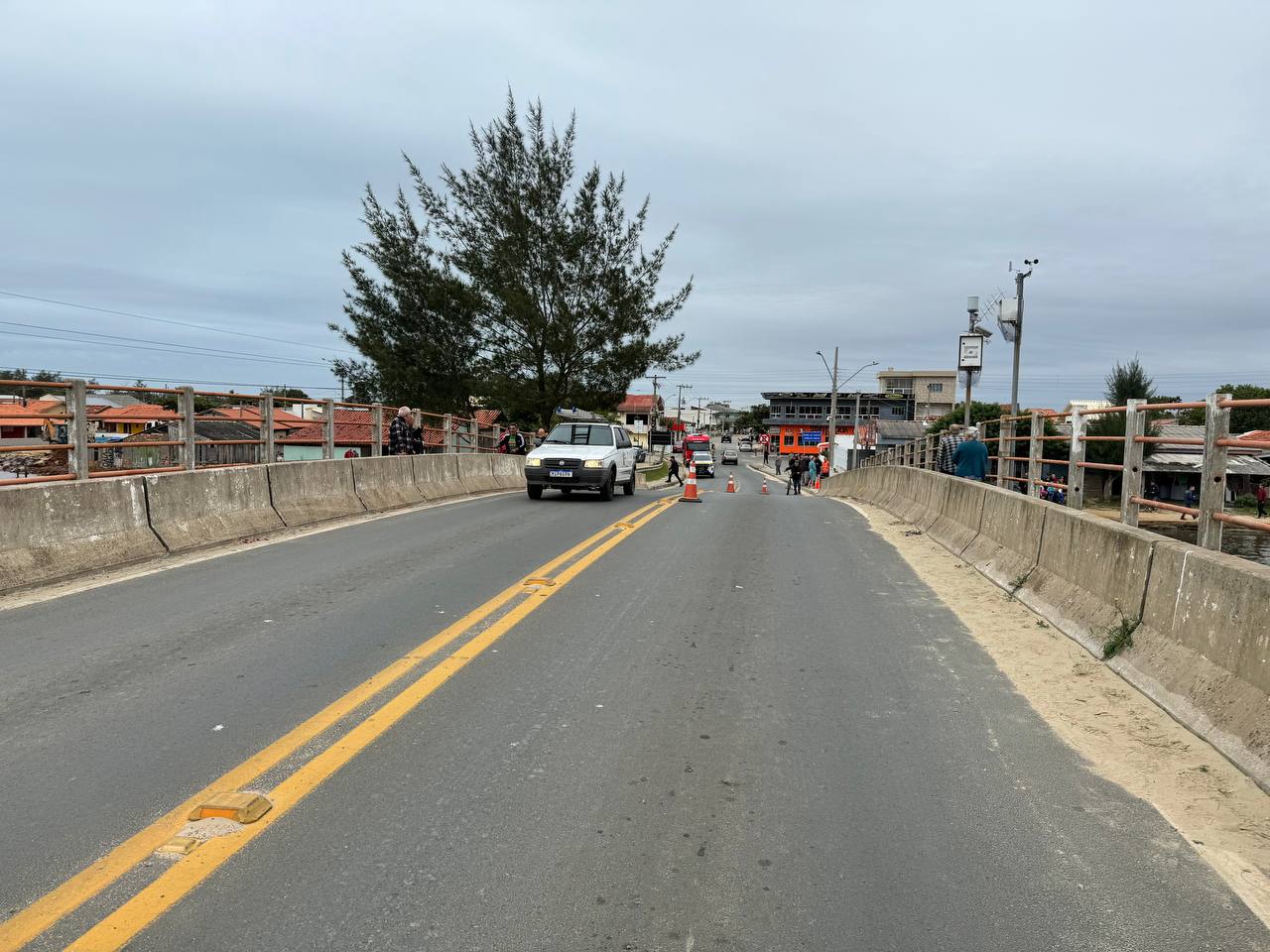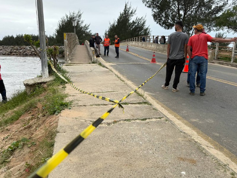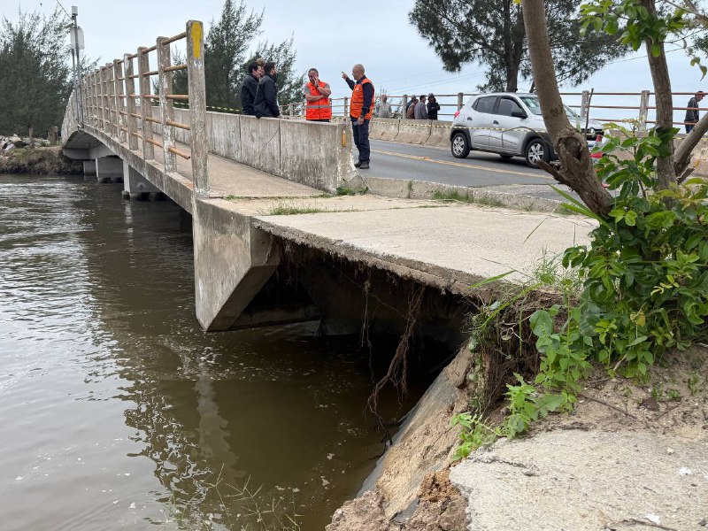 A Ponte do Camacho, na rodovia SC-100, em Jaguaruna, teve parte de sua cabeceira esquerda danificada por uma forte ressaca na madrugada desta quinta-feira (22).